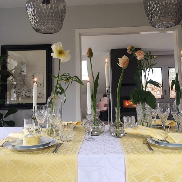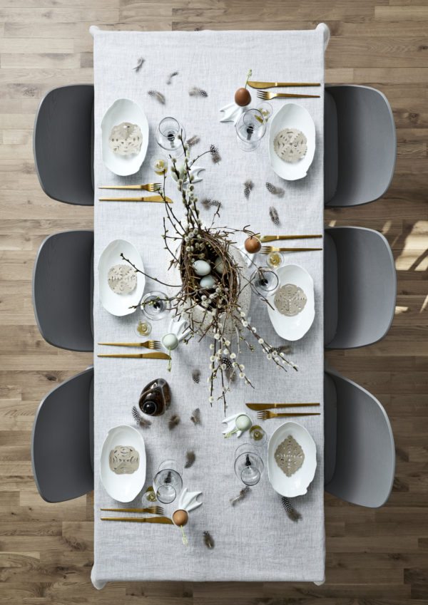 Det smukke påskebord kræver egentlig ikke så meget. Jeg synes man kommer rigtig langt med en fin dug, enten gul eller hvid og så en masse smukke forårsløg. Grønne spirer, delikate pasteller, og evt. en masse fine små æg.