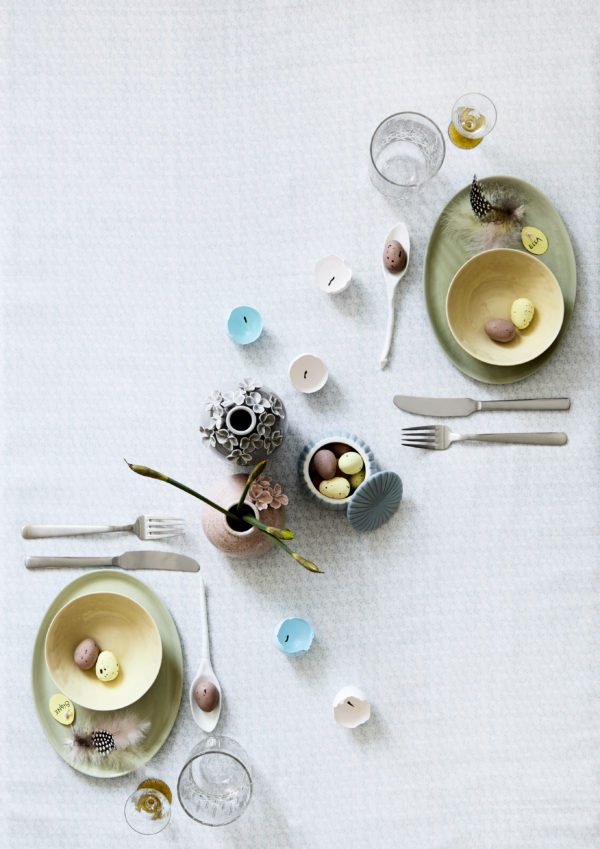 Pasteller særligt gul, grøn og lyseblå er ret påskeagtig synes jeg. Pastelfarver er du måske så heldig at kunne dække op med i form af service og hvis ikke, så køb påskeæg i de rigtig pastelfarver. En lille lågkrukke på bordet med de fine æg, kan være påskepynt i sig selv. Tilføj lidt fjer som vi gjorde herover, i en sag vi lavede for Femina sidste år.