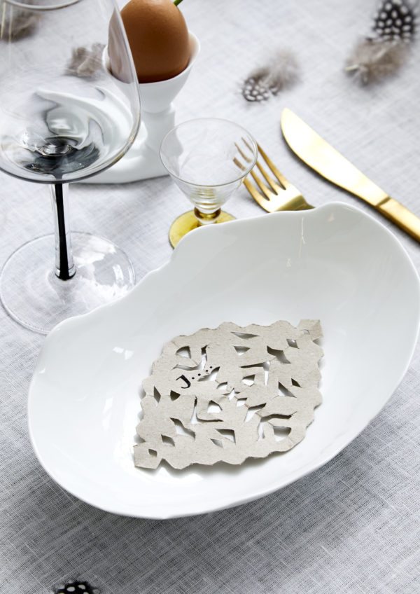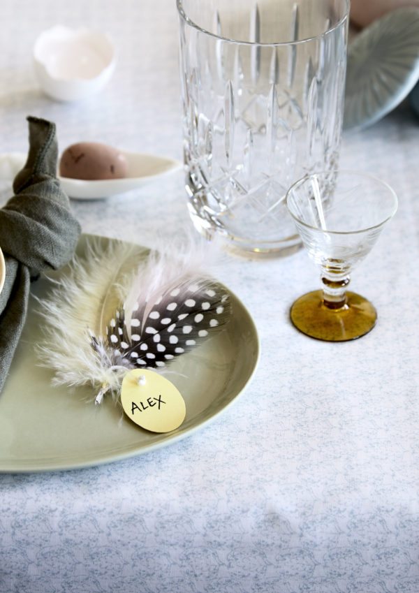 Bordkort er hyggeligt og gør det hele lidt mere højtidligt, og så er det altså alletiders tip til at kunne peppe bordet lidt mere op. Herover har vi klippe æggeformede bordkort i gul karton og bundet dem sammen med en lille buket af fjer.